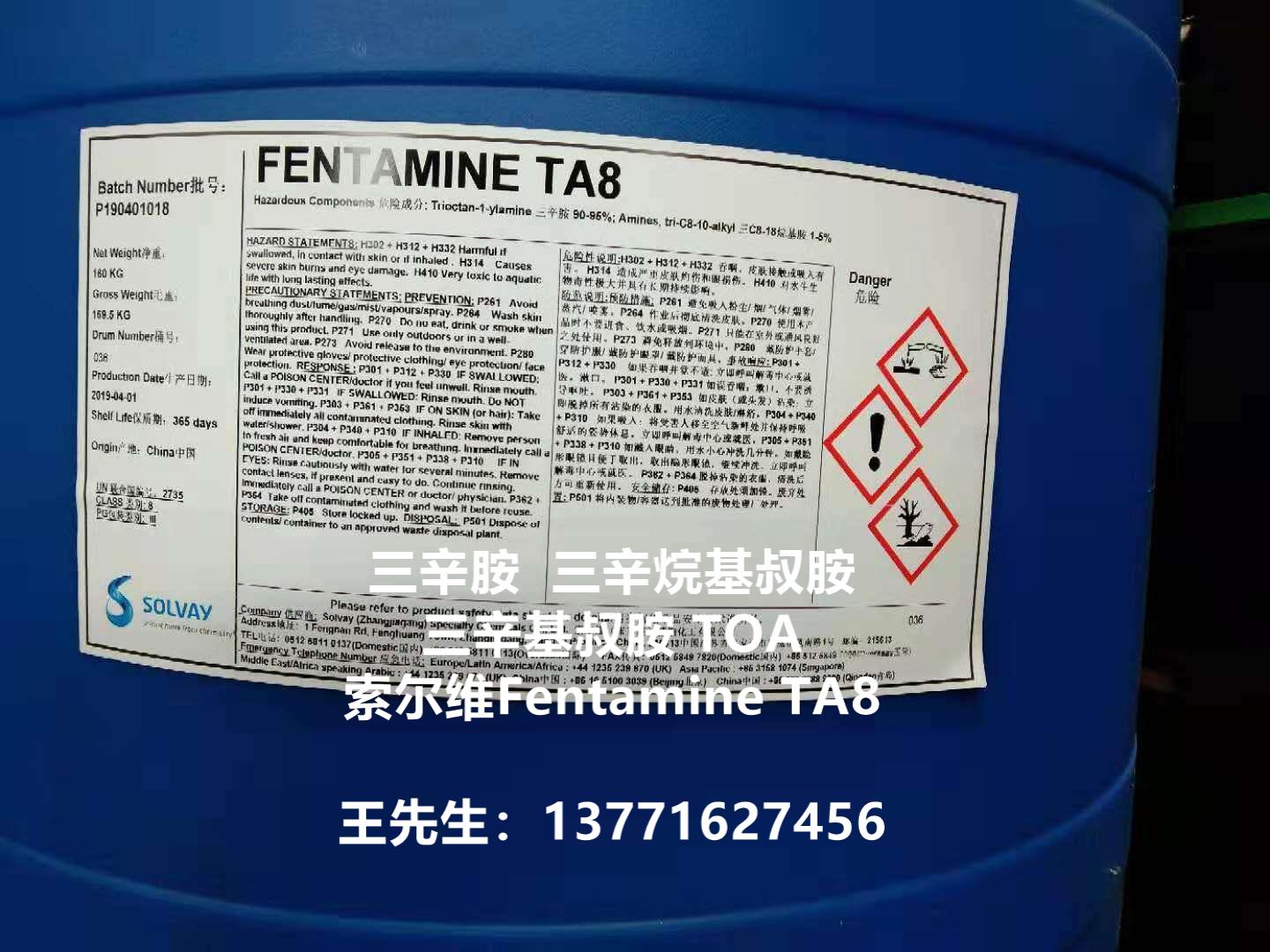 安全防護 | 三辛烷基叔胺(三辛基叔胺,三辛胺,TA8)為化工合成中間體原料,使用過程中請避免與眼睛及皮膚接觸,若有接觸,請及時用大量清水沖洗并送醫診治; |