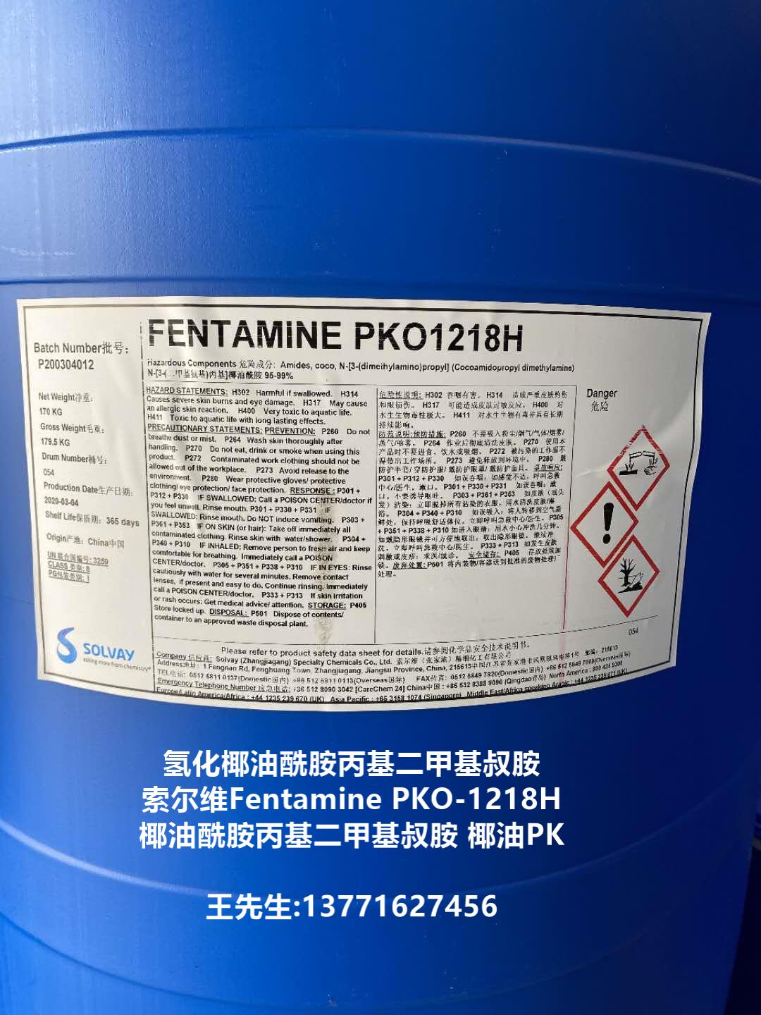 包裝 | 氫化椰油酰胺丙基二甲基叔胺(PKO-1218H, 椰油酰胺丙基二甲基叔胺, 椰油PKO)為170公斤/桶包裝;貯于室內陰涼通風處,防潮、嚴防曝曬,貯存期十二個月。 | |
