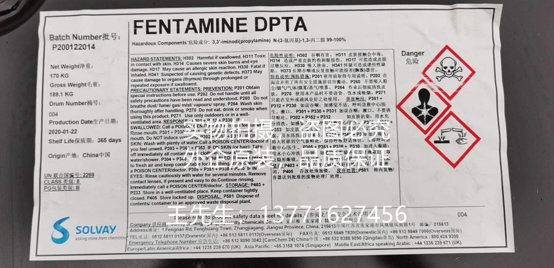 包裝 | 二丙烯三胺(DPTA,3,3'-二氨基二丙胺)為鐵桶170公斤/桶包裝,貯于室內(nèi)陰涼通風(fēng)處,防潮、嚴(yán)防曝曬,貯存期十二個月。 | |